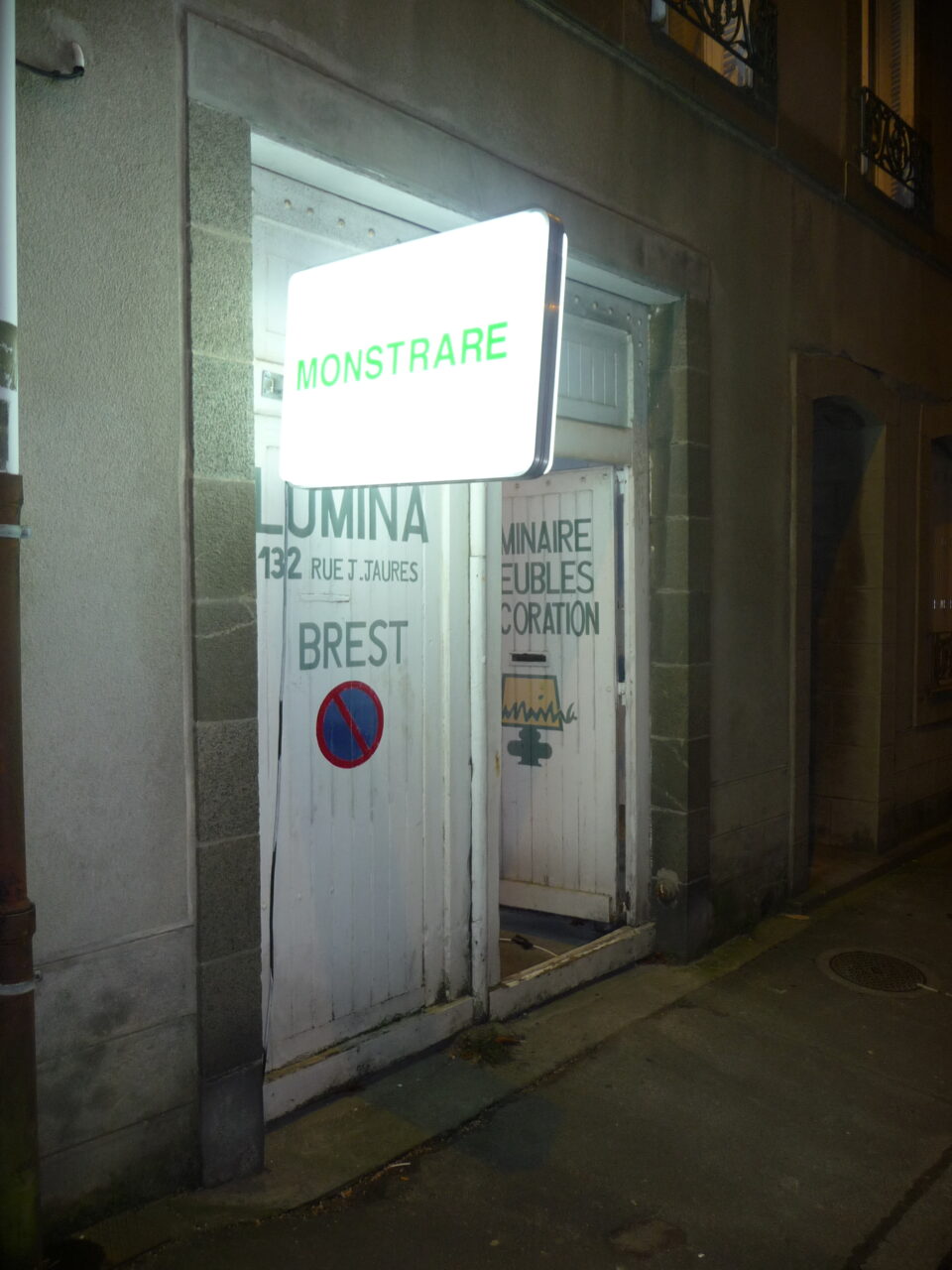 Monstrare est une initiative collective débutée à Brest en 2007 ayant pour but de réfléchir sur les divers pratiques artistiques et curatoriales contemporaines. Ses membres, alors étudiant.e.s à l’école d’art de Brest, proposaient des expositions temporaires dans divers lieux (local de stockage, garage automobile, magasin de luminaire…) occupés le temps de l’exposition contre un coup de peinture. Plusieurs expositions collectives ont ainsi vu le jour (Court-circuit, -RAMA, Nos icônes…) à Brest tout d’abord puis à Grenoble et Genève, suivant les activités de ses membres.